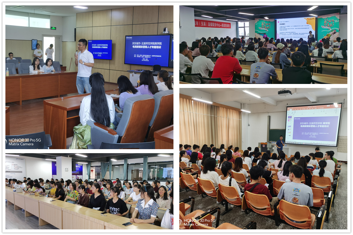 本着资源共享,人才共育,促进学校、企业和社会的共同进步为目标,京东(玉溪)新经济产业园在商学院举办了三期电商运营及新媒体营销培训,近400余名师生参与了培训。第一期于3月28日举行,由京东(玉溪)新经济产业园邀请资深电商讲师魏春雷进行培训,培训主题为“新媒体营销助力电商创新发展”;第二期、第三期于4月17日至5月30日利用四个周末时间举行,培训主题为“电商新媒体营销人才专业培训”,由京东城市(玉溪)直播服务中心承担培训任务。