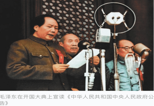 会议结束后,中央人民政府主席、副主席及各位委员集体出发,乘车出中南海东门,前往天安门城楼出席开国大典。下午3时,北京30万群众齐集天安门广场,举行隆重的开国大典。在军乐队奏响《义勇军进行曲》的雄壮乐声中,毛泽东按下电钮,广场旗杆上的第一面五星红旗冉冉升起, 28响礼炮响彻云天——这28响就是对中国共产党28年光辉历程的礼赞。毛泽东向全世界宣读《中华人民共和国中央人民政府公告》,新中国诞生的消息传遍大江南北,传向世界各地。毛泽东主席在天安门城楼上向全世界庄严宣告:"中华人民共和国中央人民政府今天成立了!”向世界宣告中华人民共和国成立。