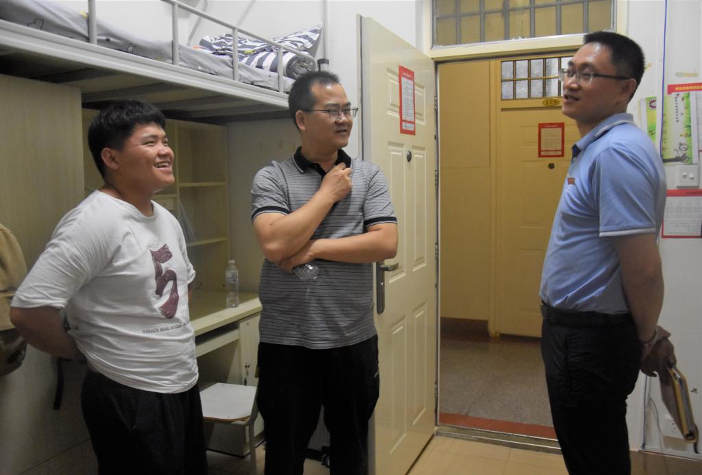 罗辉、李崇科、姜芹春、马小宁老师走访了F幢新生男寝,而石修俊和郭昆老师则走访的是B幢和7幢新生女寝。在寝室中,辅导员老师与同学们亲切交谈,询问同学们对学校环境是否满意,并就新生们关心的专业学习和课程设置等问题进行了介绍,对同学提出的问题,耐心地进行一一解答,辅导员老师仔细询问学生进校后的适应情况,鼓励新生以积极的心态尽快适应大学校园生活,并提醒新生要注意宿舍用电安全、外出交通安全、人身财物安全等安全问题,叮嘱新生有困难可以向辅导员、学校反应,共同解决。同学们纷纷表示宿舍条件很好,学姐学长很热情,对学校的迎新工作非常满意,对学校领导和老师们的关心表示感谢,对即将开始的大学生活充满期待。
