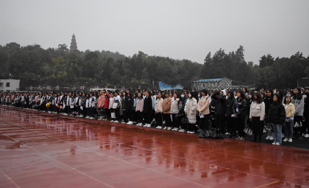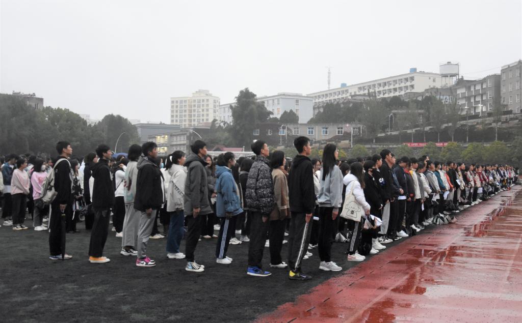 天色微亮,同学们都已准时到场,并以班级为单位迅速集合;国旗护卫队列阵在旁、庄严肃穆、严阵以待,随着一声令下,便护卫着鲜艳的五星红旗缓缓入场。同学们则身穿校服,佩戴着团徽、党徽,整齐的站在足球场上,寒风凛冽,吹不灭同学们的爱国热情。随后,伴随着庄严的《义勇军进行曲》,鲜艳的五星红旗迎风招展,冉冉升起,全体师生齐唱国歌,向国旗行注目礼。在细雨中,升旗仪式圆满结束,全体师生有序离场。