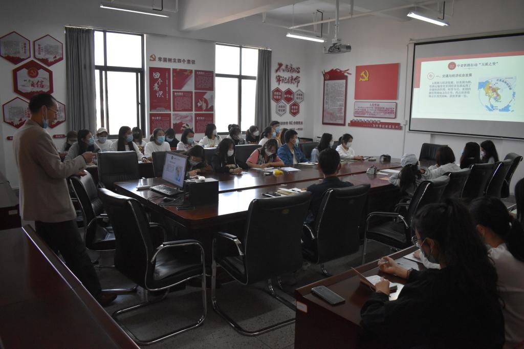为了让同学们更加清晰地理解马克思主义中国化,加强同学们的思想政治素质以及创新能力,商学院于2022年3月17日16: 00在实训大楼A座601会议室开展了“一通百通,时不待我——谈中老铁路拉动玉溪之变”主题党课。此次党课由商学院院长李崇科教授主讲,商学院辅导员杨加堂老师、商学院第一支部学生党员和商学院团学干部参加此次会议。