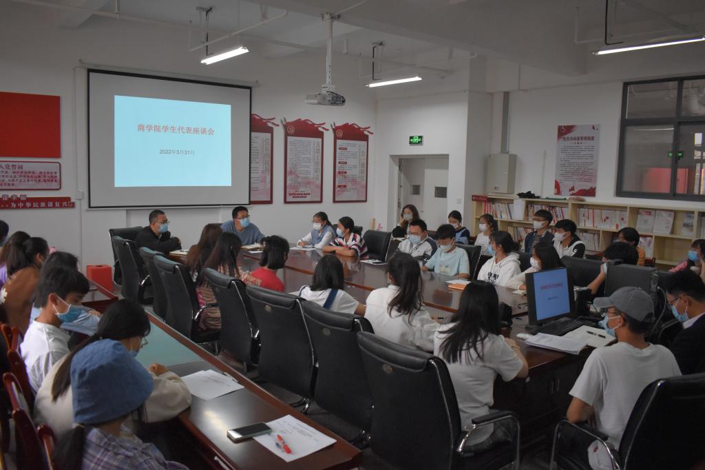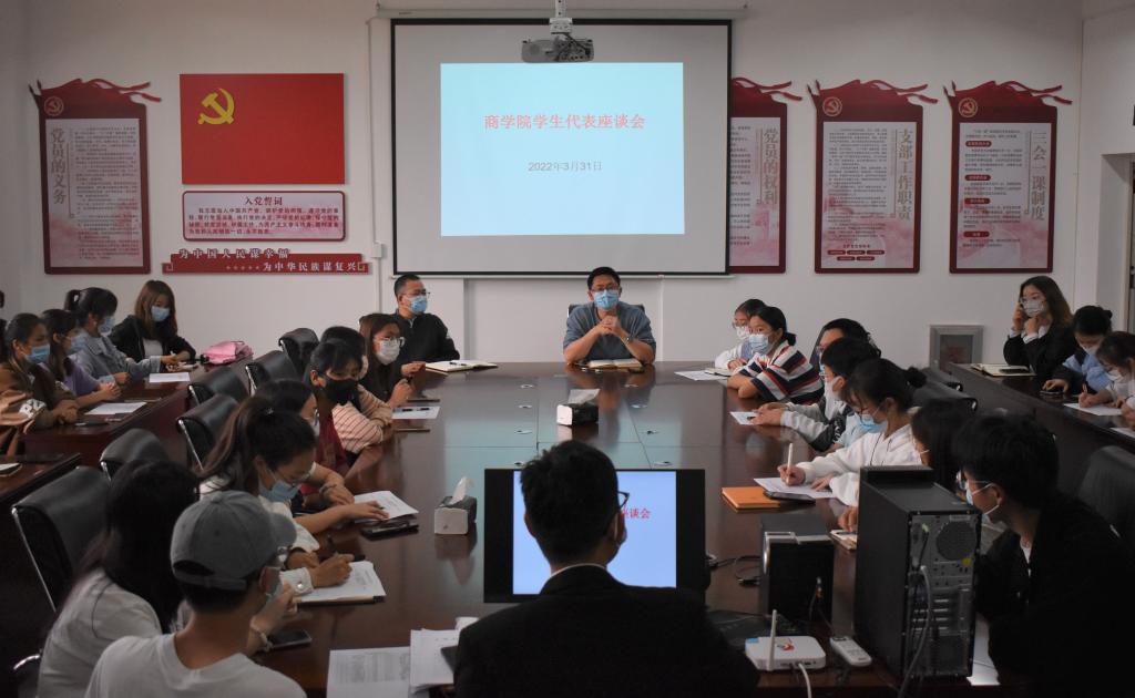 为加强我校校风建设,及时了解学生学习、生活方面的需求与困难,关爱疫情防控之下学生们的心理健康。2022年3月31日16:00商学院于实训大楼A座601举行了学生代表座谈会,出席此次会议的有商学院党委书记罗辉老师、党委副书记姜芹春老师、辅导员杨加堂老师、马艳琼老师以及各班学生代表。
