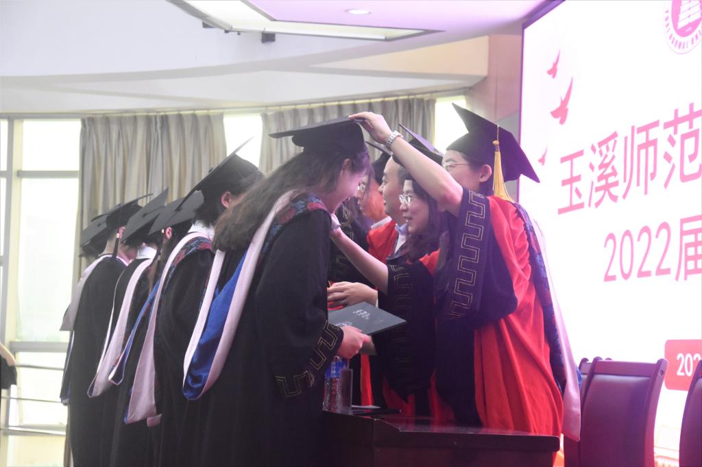 此次活动以“线上+线下”的形式开展,典礼在雄壮激昂的国歌声中拉开序幕。姜家雄教授、李崇科教授依次发表致辞,表达了他们对毕业生的殷切希望和美好祝福。随后,毕业生代表溥雪同学发言,她表示在玉师收获颇多,同学们互相进步、互相鼓励、共同成长,在学校生活的时光终生难忘;毕业班班主任马艳琼老师也进行发言,她充分肯定了同学们在大学期间所取得的成长与进步,希望同学们离开母校后,以梦为马、不负韶华,用朝气与热情奔赴新征程。紧接着,马小宁副教授、姜芹春教授依次宣读了《关于授予2022届毕业生学士学位的决定》和《2022届优秀毕业生表彰名单》,现场掌声不断。最后,商学院全体副高以上职称教师为全体毕业生授予学士学位,典礼在《毕业歌》中圆满落下帷幕。