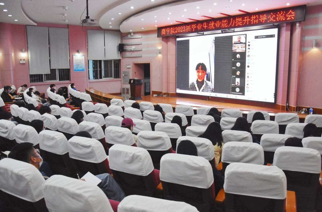 交流会采取“线上+线下”结合开展,以科学讲堂为线下会场,借助腾讯会议APP建立线上会场。商学院辅导员杨加堂老师主持会议,商学院党委副书记姜芹春老师出席会议。