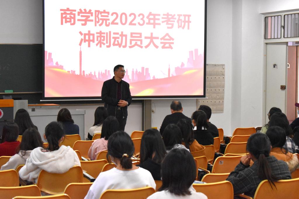 为更好地帮助考研学子备战考研,正确把握考研形势与相关政策,给考研学子加油鼓劲,2022年12月2日16:30,玉溪师范学院商学院于14教106召开考研冲刺动员大会。商学院院长李崇科老师、党委书记罗辉老师、党委副书记姜芹春老师、各学科系主任、班主任出席此次活动,商学院2019级考研同学积极参与。