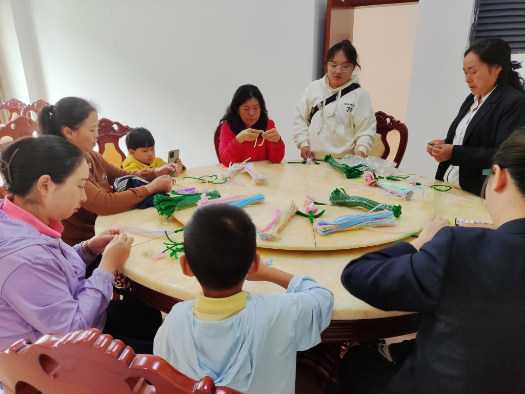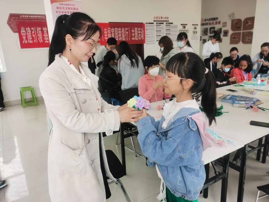在活动开展前,青履志愿者开展了扭扭花手工制作的培训,大家通过小红书等平台相关视频认真学习制作技巧。活动当天,志愿者们向社区儿童分发扭扭花制作材料,并手把手指导小朋友制作形态各异的花朵。同时,还与小朋友们开展了制作技巧、亲子故事的分享,在关于“美丽的妈妈”、“幸福的家庭”这些话题的讨论中,与小朋友交流对母亲的祝福,怎样去有效表达对母亲的爱。美丽的扭扭花背后都是大家对母爱的真诚祝福,一朵“永不凋零”的花寓意着一份永恒的爱。活动结束时,志愿者们将自己和小朋友们一起亲手做的花花送给了在场妈妈们并送上了真挚的母亲节祝福,愿所有的母亲多喜乐,常安康!