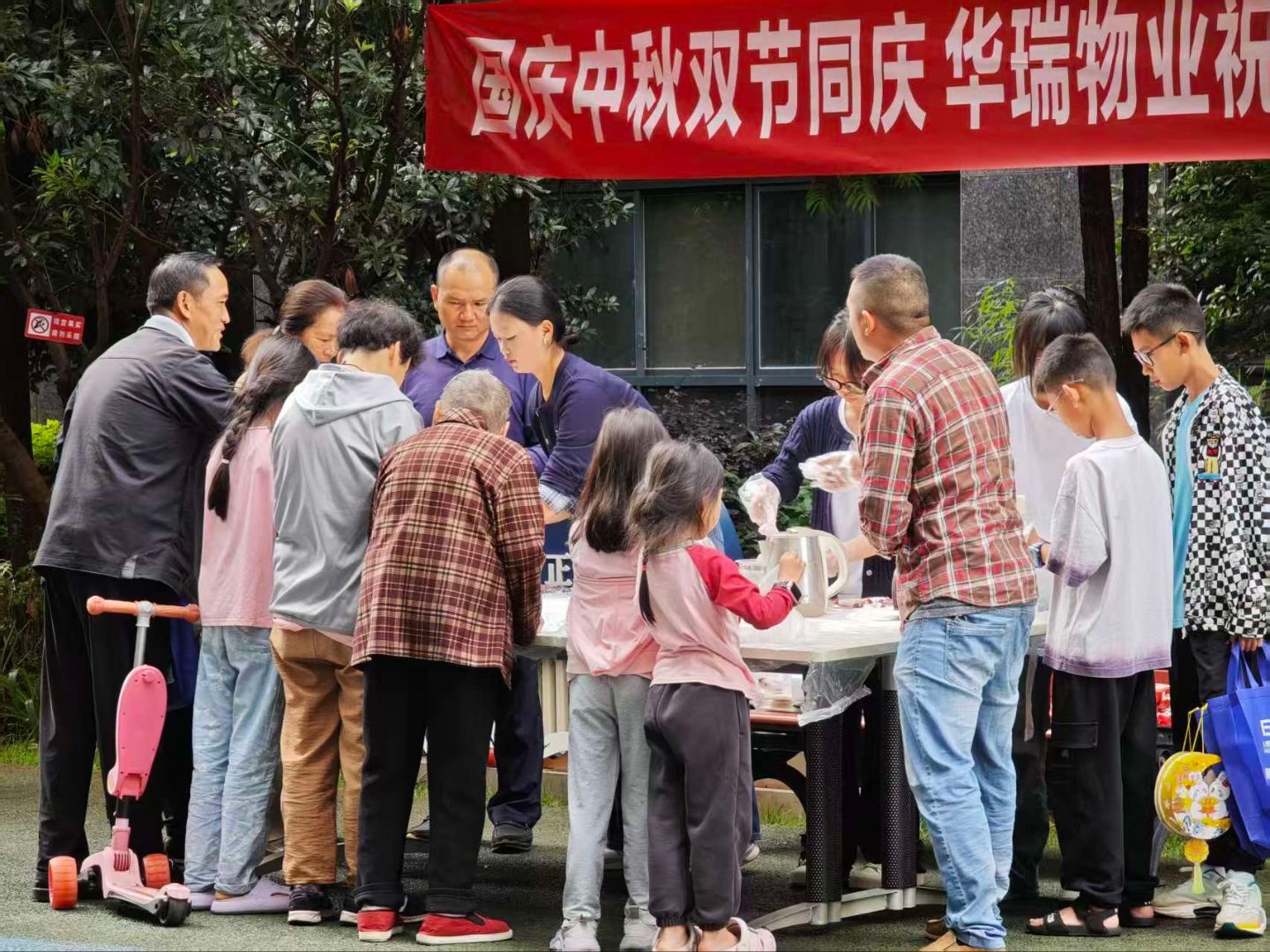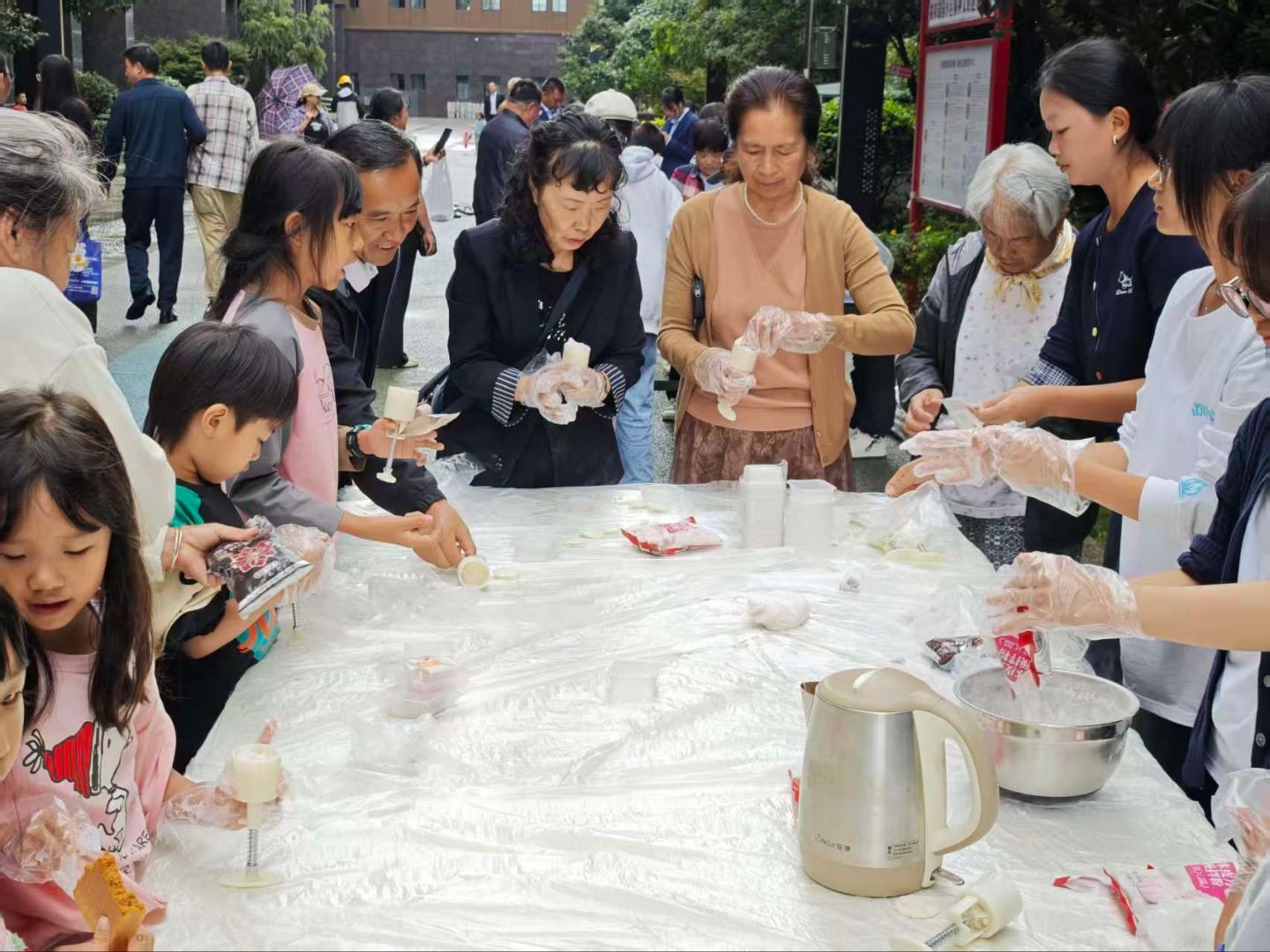 福禄瑞园那边,8个月饼模具同时开工,月饼材料一会儿就用了大半。还有猜灯谜的环节,100张灯谜纸条挂得满满当当,居民们凑在一起猜,猜对了就能领礼品,志愿者们在旁边不停地给大家递礼品,忙得满头大汗却笑得很开心。
