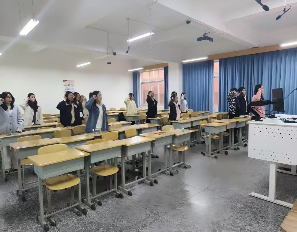 仪式在庄严肃穆的国歌声中拉开帷幕,全场肃立致敬,爱国情怀油然而生。马艳琼老师宣读新团员名单并致以热烈祝贺,勉励他们以入团为契机砥砺初心、勇担使命。随后,学生干部代表为新团员颁发团员证与《中国共产主义青年团章程》,红色证书承载着组织的信任与殷切期望。在团旗映照下,全体新团员高举右拳庄严宣誓。“我志愿加入中国共产主义青年团……”铿锵誓言响彻教室,既是对团组织的郑重承诺,更是新时代青年矢志跟党走的坚定宣言。商学院团委对新团员提出三点期望:牢记入团誓词,履行团员义务;深学细悟团章,增强团员意识;将誓言转化为行动,在学业上锐意进取、在实践中勇于担当,争做新时代好青年。